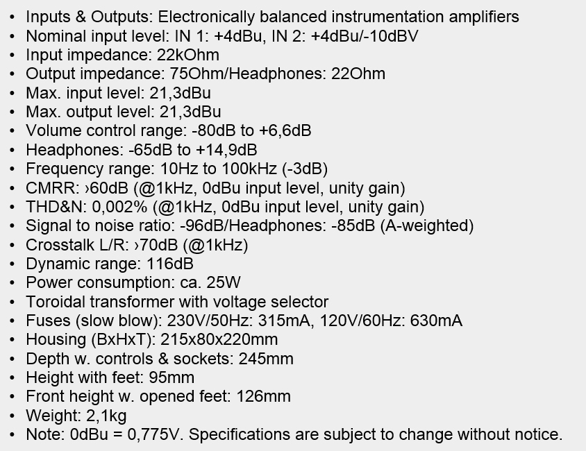 נתיב האודיו עובר דרך מעגלים שקופים לחלוטין באיכות עילאית, ובנוסף על שליטה בניתוב האודיו קיים גם מתג הנחתה (DIM), מתג לבחירה בין האזנה במונו/סטריאו ומתג לחיבור/ניתוק ההארקה.