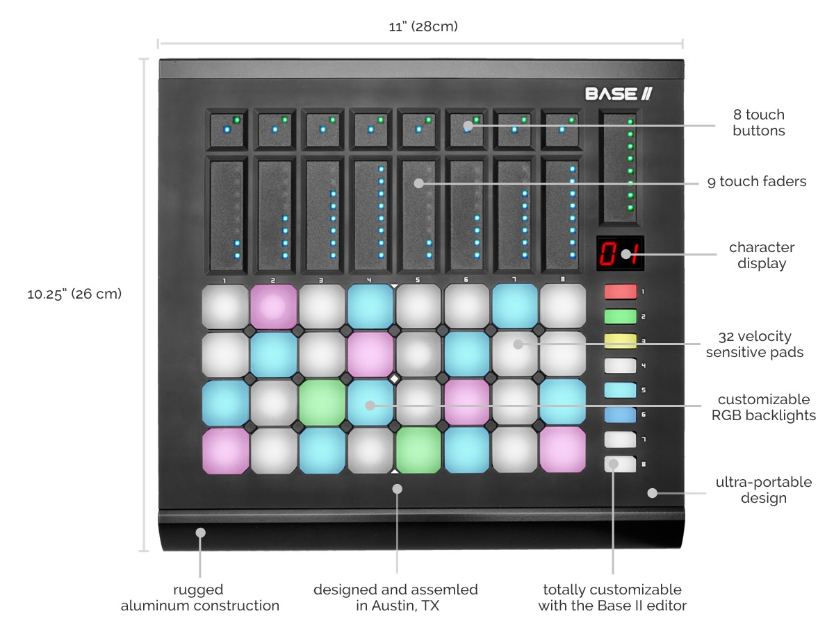 ה BASE II הוא שלט וורסטילי ומקצועי לביצועים גבוהים מ LIVID המעניק שליטה בפלאג-אינים, נגינת ביטים, תופים, סינטיסייזרים ואפקטים באיכות ייצור ורכיבים הגבוה ביותר בתחום שלטי התוכנה, שכל רכיב נבחר בקפידה על פי אמינות ותחושה ביצור ידני בארה"ב. ה Base II מכיל סט שלטים יצירתי הכולל 8 ערוצים של פיידרים וכפתורים מבוססי Touch בפריסת מיקסר סטנדרטית ו-32 פדים רגישים למגע בעלי After touch ותאורה צבעונית. הוא מגיע מוכן עם מיפויים רשמיים לכל התוכנות הפופלאריות כמו Ableton Live, Max for live, NI Traktor, FL Studio, Bitwig Studio, Reason ועוד רבות עם תבניות מובנות לשינוי המיפוי בזמן אמת ( סרטוני הדגמה בדף המוצר ). תוכנת המיפוי המצורפת מאפשרת שינוי הגדרות קל של מיפויים, צבעים ופרי-סטים בהתאמה לכל תוכנה. ה BASE II בנוי לעבודה של שנים ארוכות יום אחרי יום, הוא בנוי מהרכיבים האיכותיים ביותר תוצרת ארה"ב, מתחבר בחיבור USB יחיד לא צורך בדרייברים ועם תמיכה מלאה למשתמשים מבית פאנקי.