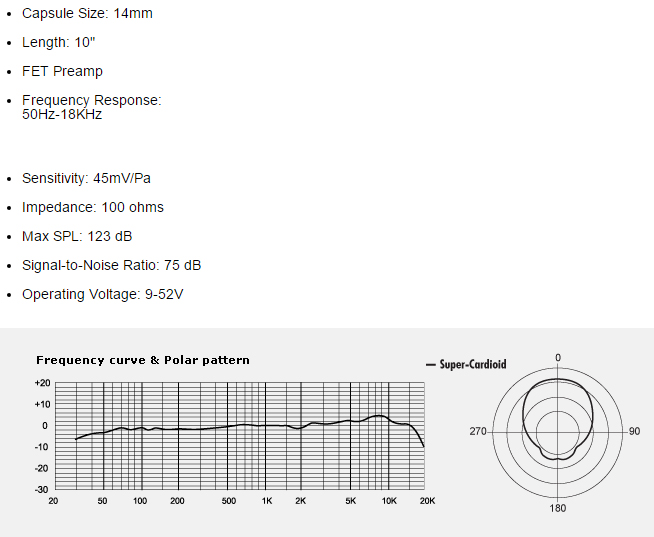 מיקרופון שוטגאן (shotgun) מקצועי להקלטות שטח והפקות וידאו/קולנוע. ניתן להפעלה באמצעות מתח פאנטום או סוללה, קל משקל ובעל מקרם קליטה מדוייק המנחית רעשי רקע לרמה מינימאלית (היפר-קרדיו).