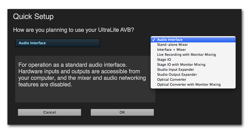 התקנה פשוטה וקלה שחוסכת למידה למקצוענים ומקלה רבות על מתחילים שלא מוכנים להתפשר. ממשק בחירה מאפשר בלחיצה אחת להגדיר את ה Ultralite AVB למגוון מצבי עבודה, ככרטיס קול בסיסי, מיקסר לעבודה ללא מחשב, שילוב של השניים הנ"ל, מערכת הקלטת הופעות עם שליחות למוניטור, קופסת במה, ממיר 8 כניסות או ממיר 8 יציאות ל ADAT ללא צורך בהגדרות נוספות במיקסר.