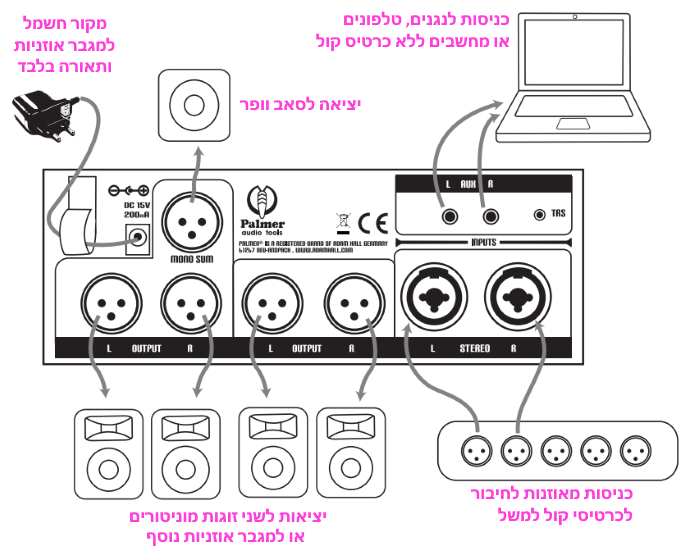 ה Monicon L מכיל זוג כניסות לשני מקורות שמע: XLR ו- RCA עם כפתור הבורר בין הכניסות. זוג יציאות XLR מאוזנות לחיבור שתי זוגות מוניטורים, חיבור XLR נפרד ונוסף לסאב-וופר עם כיבוי והדלקה מהיר ויציאת אוזניות חזקה ( לאוזניות עד 600Ohm ) הפועלת על ידי שנאי המספק כוח למגבר האוזניות ולתאורה בלבד עם תמורה למחיר ששווה כל שקל ב 979 ₪ בלבד.