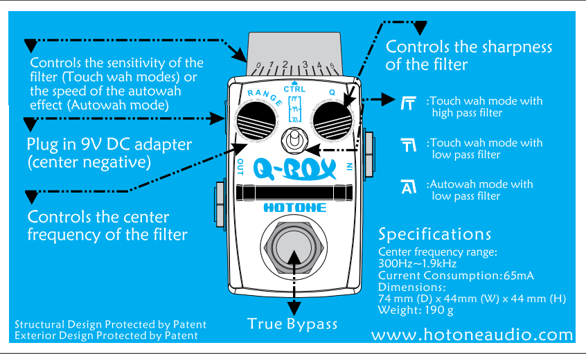 Hotone Q-BOX Auto Wah Wah עם שליטה על תדר החיתוך, מהירות, ותחום האפקט, כולל חיתוך נמוכים או גבוהים לבחירה והכל מפדל קומפקטי במיוחד