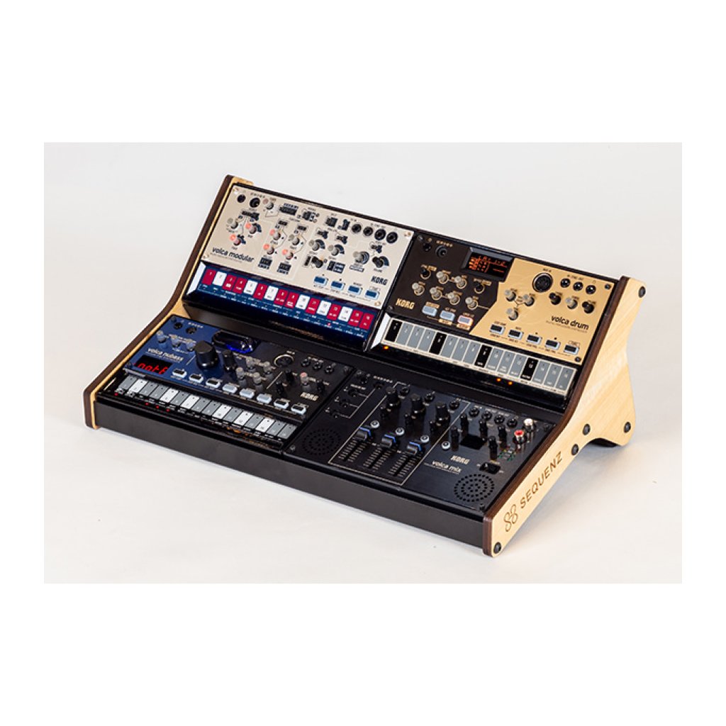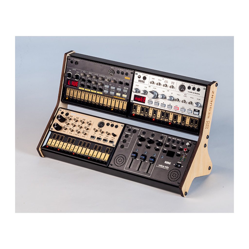 סטנד ראק (rack) עם מקום ל4 יחידות של סדרת VOLCA של KORG צידי הסטנד עשויים עץ ובצורה א-סימטרית כך שניתן לסובב את הסטנד למי שמעדיף יותר עומק או גובה. הסטנד יציב מאוד עם מסגור אלומיניום עמיד ורגלי גומי.