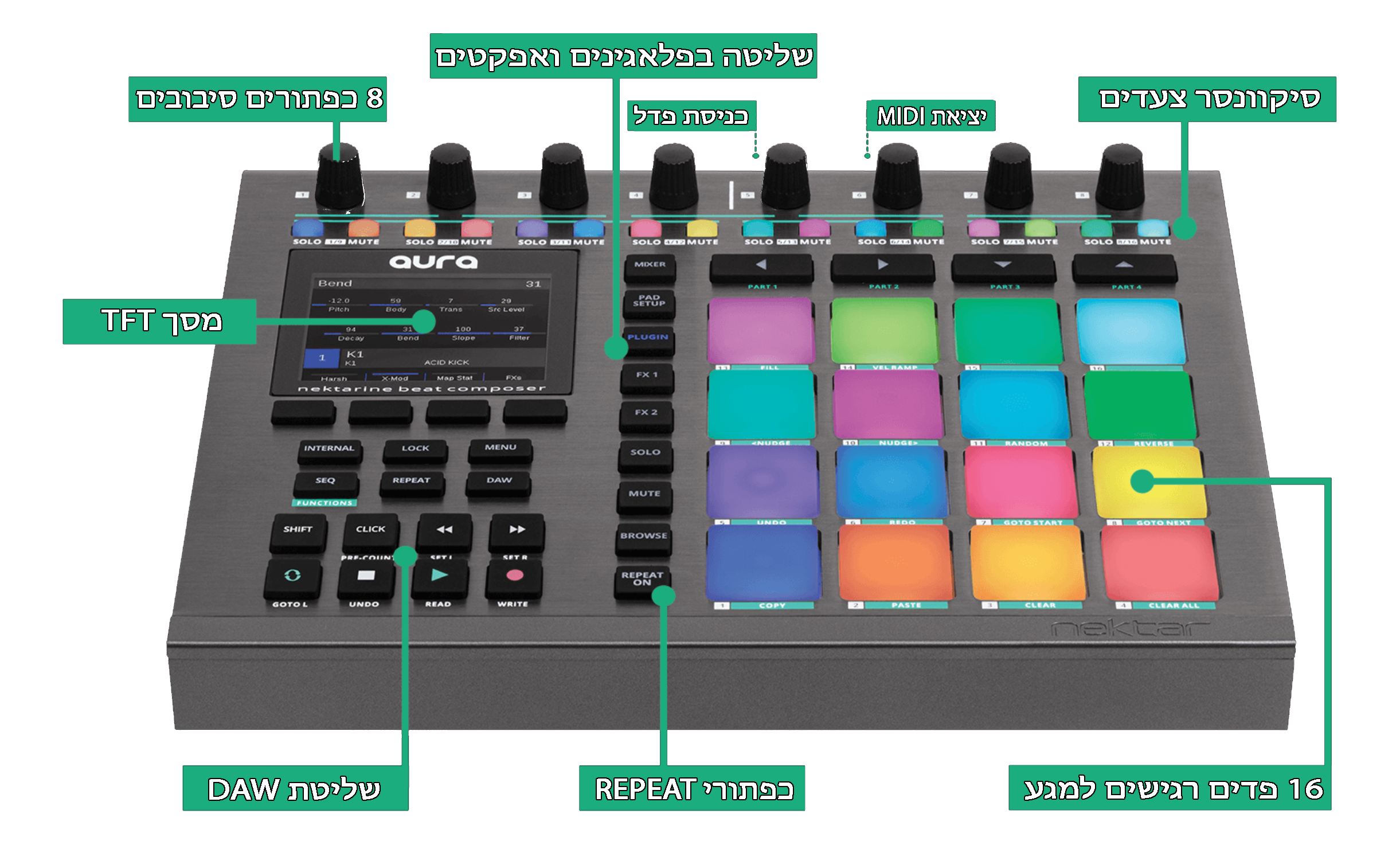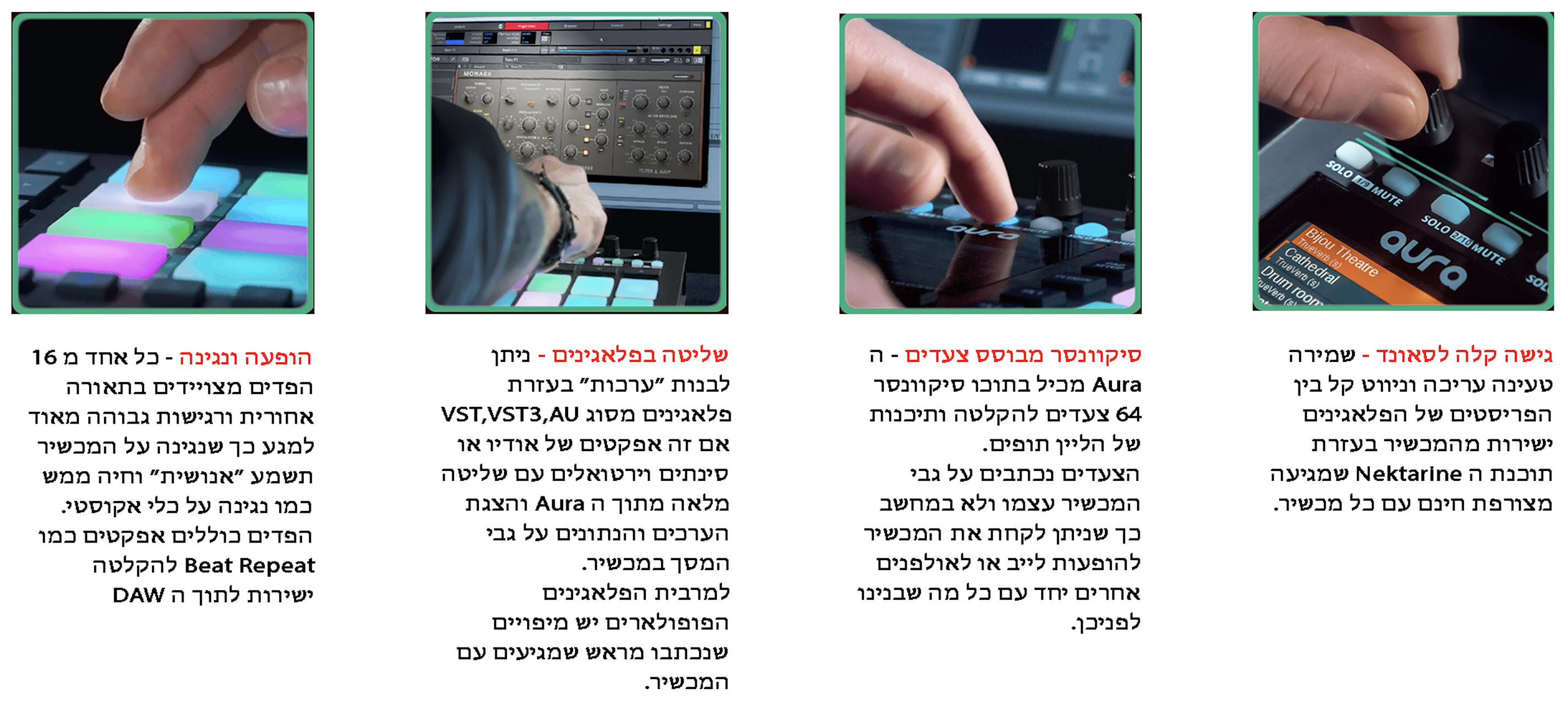 ל Aura יש סיקוונסר 64 צעדים ו 16 פדים מוארים לתיפוף עם רגישות למגע (Velocity) , כפתורי בקרה (TRASPORT) לDAW ותוכנת Nektarine 2.0 אשר מאפשרת שליטה וסנכרון מלא מול הפלאגינים במחשב עם ה Aura