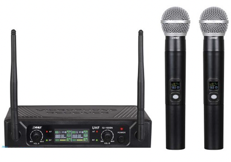 ערכה אלחוטית לאירועים אשר מכילה זוג מיקרופונים אלחוטיים בעלי תדר קבוע UHF