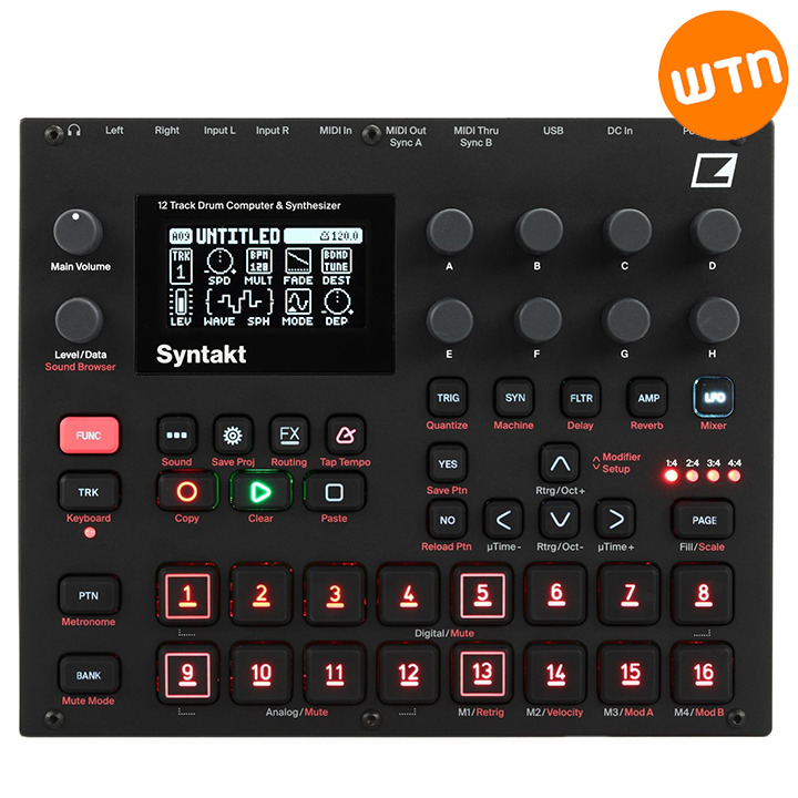 Elektron Syntakt היא מכונת תופים היברידית המשלבת מנועי סינתזה אנלוגיים ודיגיטליים, ומעניקה יוצרי מוזיקה כלים אינסופיים לעיצוב קצב וצליל. המכשיר כולל 12 ערוצים – כל אחד מהם ניתן להגדיר כקול תופים, כלי מלודי או אפקט, מה שהופך את ה-Syntakt לליבה יצירתית של כל סט אולפני או הופעה חיה.