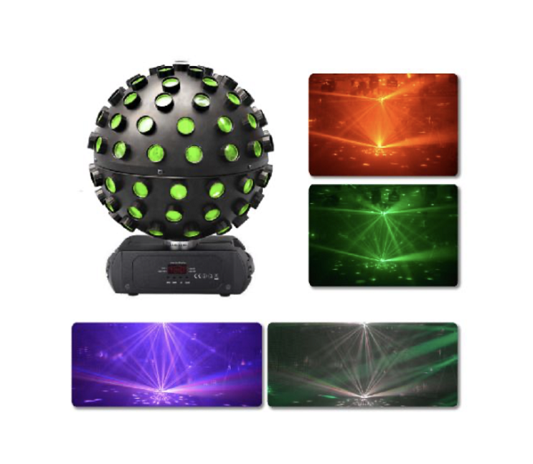 פנס אפקטים מקצועי למסיבות היוצר תאורה בסגנון כדור מראות, הפנס מסתובב פיזית עם 98 יציאות אור צבעוניות ועוצמתיות עם מעגלי צבע מלאים RGBWA + UV