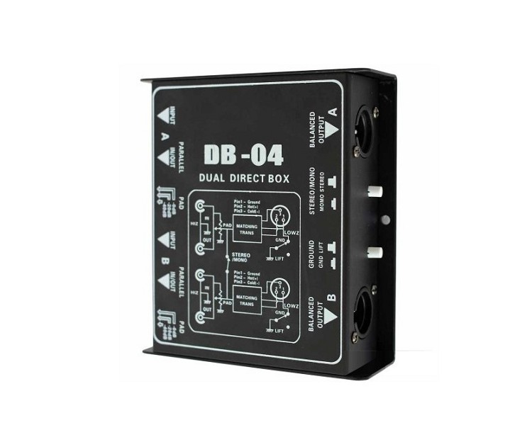 קופסאת DI פאסיבית בעלת זוג כניסות PL 6.3 וזוג ויציאת XLR.