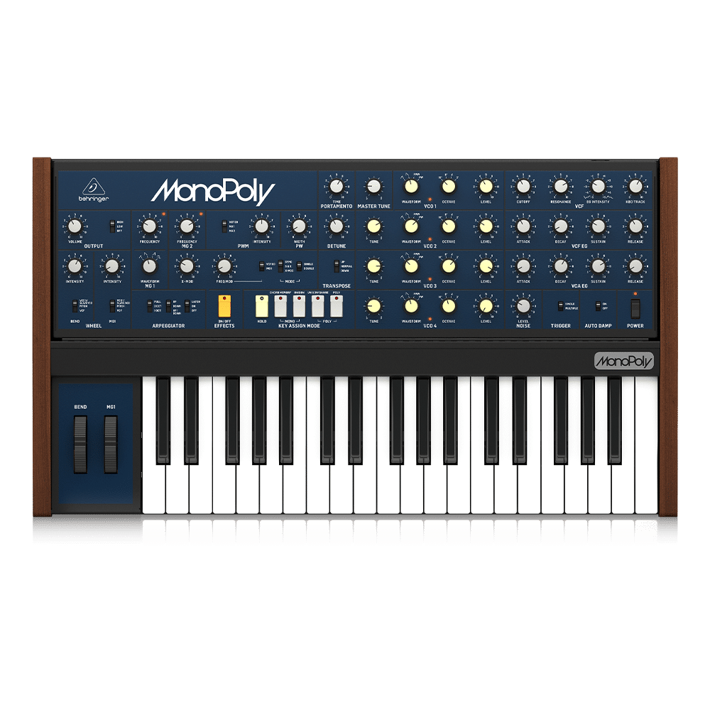 סינתיסייזר Behringer MonoPoly מעניק לכם חוויית יצירה אנלוגית עשירה ומרגשת מאוד. המכשיר מהווה שחזור מדויק של מעגלי ה-MonoPoly המפורסמים משנות ה-80. חברת Behringer בנתה כאן מפלצת סאונד עם ארבעה אוסילטורים (VCO) המייצרים צליל שמן. בזכות התכנון הגמיש, המשתמש עובר בקלות בין מצבי נגינה מונופוניים, פאראפוניים ופוליפוניים. המכשיר כולל 37 קלידים בגודל מלא עם רגישות למגע (Velocity) לנגינה טבעית. לכן, פשוט סובבו את הכפתורים ותיהנו מסאונד עמוק ומלא אופי בתוך שניות. פונקציית ה-Autotune המובנית שומרת על יציבות האוסילטורים לאורך כל זמן העבודה. בנוסף, המכשיר כולל פאנל קדמי מתכוונן המאפשר גישה נוחה לכל הבקרים.